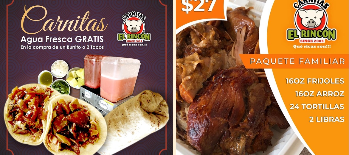 Carnitas El Rincon specializes in authentic Michoacan flavors. Popular dishes include tacos, burritos, and traditional carnitas. The menu features a variety of options for everyone, including family dishes and unique combos.